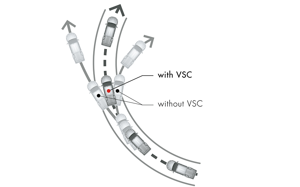 نظام التحكم باستقرار السيارة (VSC) يساعد على منع انزلاق العجلات الأمامية أو الخلفية أثناء دوران المنعطفات وذلك عن طريق خفض قدرة المحرّك واستخدام قدرة القرامل على العجلات التي تحتاج إليها