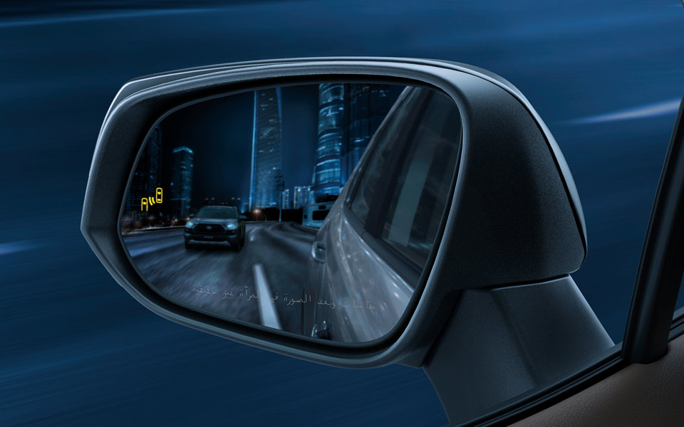 نظام التحذير للنقاط العمياء عند رصد سيارة في المنطقة العمياء للمرآة الخارجية أثناء تغيير المسار يقوم نظام مراقبة البقعة غير المرئية بتشغيل مؤشر المرآة لتنبيه السائق